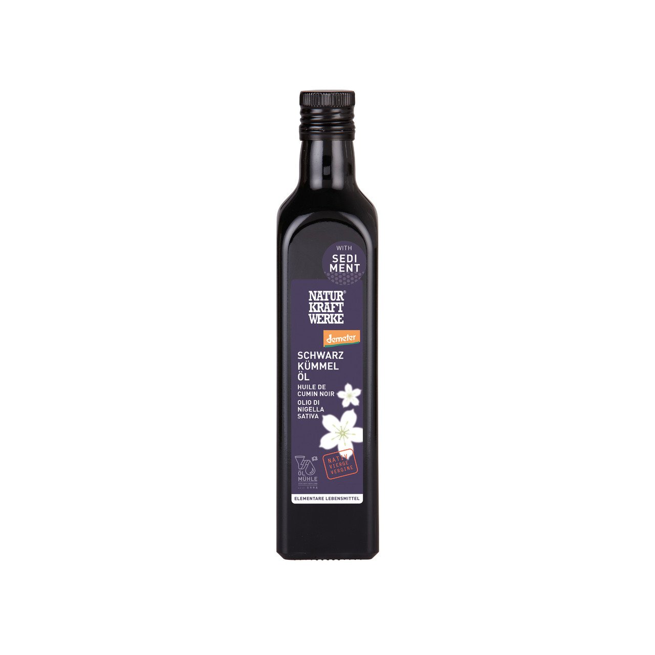 Huile de cumin noir vierge*** (Nigella sativa) avec sédiment. Légende: * Biologique, ** Bourgeon, *** Demeter